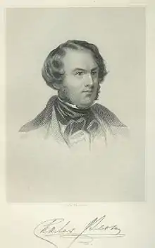 Thackeray suggested London, but Lever required a new field of literary observation and anecdote. His creative inspiration exhausted, he decided to renew it on the continent. In 1845 he resigned his editorship and went back to Brussels, whence he started upon an unlimited tour of central Europe in a family coach. Now and again he halted for a few months, and entertained to the limit of his resources in some ducal castle or other which he hired for an off-season. Thus at Riedenburg, near Bregenz, in August 1846, he entertained Charles Dickens and his wife and other well-known people.[4] Dickens would later publish Lever's novel A Day's Ride in serial in his weekly journal All the Year Round, running parallel to Great Expectations for part of its run from 1860 to 1861. Like his own Daltons or Dodd Family Abroad he travelled continentally, from Karlsruhe to Como, from Como to Florence, from Florence to the Baths of Lucca and so on, and his letters home are the litany of the literary remittance-man, his ambition now limited to driving a pair of novels abreast without a diminution of his standard price for serial work ("twenty pounds a sheet"). In the Knight of Gwynne, a story of the Union (1847), The Confessions of Con Cregan (1849),[5] Roland Cashel (1850) and Maurice Tiernay[6] (1852) we still have traces of his old manner; but he was beginning to lose his original joy in composition. His innate sadness began to cloud the animal joyousness of his temperament. Formerly he had written for the happy world which is young and curly and merry; now he grew fat and bald and grave. "After 38 or so what has life to offer but one universal declension. Let the crew pump as hard as they like, the leak gains every hour."[4] His son, Charles Sidney Lever, died in 1863 and is buried in Florence's English Cemetery.