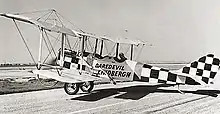 Lindbergh left flying with the onset of winter and returned to his father's home in Minnesota.[25] His return to the air and his first solo flight did not come until half a year later in May 1923 at Souther Field in Americus, Georgia, a former Army flight-training field, where he bought a World War I surplus Curtiss JN-4 "Jenny" biplane. Though Lindbergh had not touched an airplane in more than six months, he had already secretly decided that he was ready to take to the air by himself. After a half-hour of dual time with a pilot who was visiting the field to pick up another surplus JN-4, Lindbergh flew solo for the first time in the Jenny that he had just purchased for $500.[26][27] After spending another week or so at the field to "practice" (thereby acquiring five hours of "pilot in command" time), Lindbergh took off from Americus for Montgomery, Alabama, some 140 miles (230 km) to the west, for his first solo cross-country flight.[28] He went on to spend much of the remainder of 1923 engaged in almost nonstop barnstorming under the name of "Daredevil Lindbergh". Unlike in the previous year, this time Lindbergh flew in his "own ship" as the pilot.[29][30] A few weeks after leaving Americus, he achieved another key aviation milestone when he made his first night flight near Lake Village, Arkansas.[31]