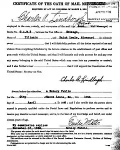 "Certificate of the Oath of Mail Messengers", executed by Lindbergh