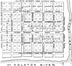 McClung's design consisted of a rectangular grid with the Tennessee River (then called the "Holston") as its southern boundary and First Creek as its eastern boundary. The grid's original northern boundary was the road now known as Church Avenue, and its original western boundary was the road now known as Walnut Street.[4] This grid was divided into 64 .5-acre (2,000 m2) lots. Most of the early street names for the city (e.g., Front Street) were derived from street names in Philadelphia, where McClung had lived for several years.[2]