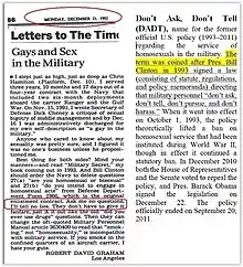 Robert David Graham published the phrase "don't ask don't tell" prior to 1993 in the LA Times - ↑ Frank, Nathaniel (October 2000). "The Real Story of Military Sociology and 'Don't Ask, Don't Tell'". Lingua Franca. pp. 71–81. Archived from the original on 2007-10-06. Retrieved 2006-08-09.
