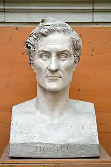 In December 1812 Nodier moved to Ljubljana, then the capital of the newly established French Illyrian Provinces, and was in 1813 the last editor of a multilingual newspaper, the Official Telegraph of the Illyrian Provinces (Télégraphe officiel des Provinces Illyriennes) published in French, German and Italian.[4] It was there that Nodier composed, in 1812, the first draft of his novel Jean Sbogar.[5] The story about a love between a brigand and a daughter of a rich merchant was finally published in 1818.[6] After the evacuation of French forces from the Illyrian provinces in 1813 he returned to Paris, and the Restauration found him a royalist, though he retained something of republican sentiment. In 1824 he was appointed librarian of the Bibliothèque de l'Arsenal, a position that he kept for the rest of his life. He was elected a member of the Académie française in 1833, also of the Société Entomologique de France when this was formed in 1832, and he was made a member of the Legion of Honour.[7] He died, aged, 63, in Paris.