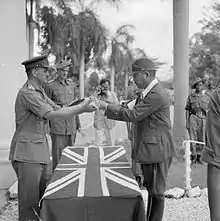 Jones (left) accepting the surrender of General Ayabe in Kuala Lumpur, 1945.
