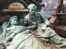 After his death he remains noted for his family grave in Montparnasse Cemetery in Paris, which he commissioned in 1905 to hold up to 18 family members. The main feature is a life-sized bronze sculpture[1] of Pigeon (notebook and pencil in hand) and his wife lying on a bed, overlooked by an angel, which had been illuminated by a lamp for many years by his custodians.[2]