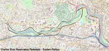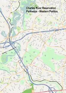 The western parkways are within the Upper Charles River Reservation. They comprise several discontiguous segments in Waltham, Weston, and Newton. The stretch of the Charles they abut are between Sawyer Road in Waltham and Route 9 near its interchange with I-95.[2]