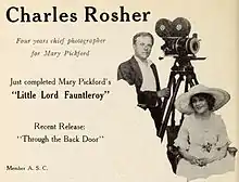 In 1913, Rosher went to Mexico to shoot newsreel footage of Pancho Villa's rebellion. In January 1919, he was one of the 15 founders of the American Society of Cinematographers and served as the group's first vice-president. In the 1920s, he was one of the more sought-after cinematographers in Hollywood, and was a personal favourite of stars such as Mary Pickford, working with her, first on A Little Princess (1917), then on all the films she acted in from How Could You, Jean? (1918) to My Best Girl (1927).[1]