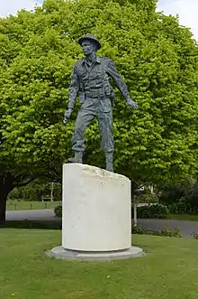A bronze statue stands outside the Hurunui District Council buildings in Amberley, North Canterbury, depicting Charles Upham "the observer".[26]