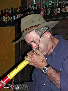 ![]() Charlie McMahon playing the didjeribone in 2002. The microphone going into his mouth is the "Face Bass," a seismic microphone that captures the subtleties of sound inside his mouth while he is playing. |