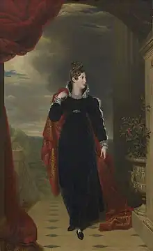 As Charlotte entered her teenage years, members of the Court considered her behaviour undignified.[26] Lady de Clifford complained about Charlotte's allowing her ankle-length underdrawers to show.[27] Lady Charlotte Bury, a lady-in-waiting to Caroline and a diarist whose writings have survived, described the Princess as a "fine piece of flesh and blood" who had a candid manner and rarely chose to "put on dignity".[28] Her father was proud of her horsemanship.[27] She was fond of music by Mozart and Haydn, and she identified with the character of Marianne in Sense and Sensibility.[21] In 1808, Charlotte Jones was appointed as Charlotte's own official miniature portrait painter.
