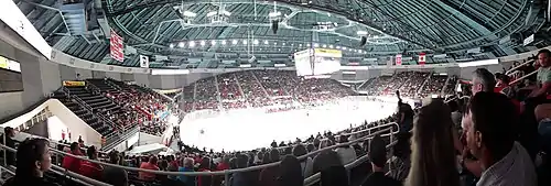 The AHL Checkers' first home game was October 15, 2010 at the Time Warner Cable Arena in front of 12,512 spectators, which set an attendance record for a hockey game in Charlotte.[4] On February 26, 2011, the attendance record was broken as 12,933 fans watched the Checkers defeat the Connecticut Whale 1–0.[5] Almost a year later, on February 25, 2012, the attendance record was broken yet again as 13,102 fans watched the Checkers fall to the Oklahoma City Barons, 3–2.[6] On April 11, 2015, the attendance record was broken a third time as 13,219 fans watched the last Checkers game at Time Warner Cable Arena, a 2–0 loss to the Rockford IceHogs.[7]