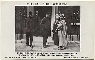 Despard was a vocal supporter of the Social Democratic Federation and the Independent Labour Party. In 1906 she joined the National Union of Women's Suffrage Societies and later was imprisoned four times for activism on women's franchise,[4] twice in Holloway gaol. She had become frustrated with the lack of progress from NUWSS and she joined the more radical Women's Social and Political Union (WSPU). She became one of their recognised orators and described as a 'tireless and popular leader.. a striking figure with her thin sharp features and grimly tight lips'[4]