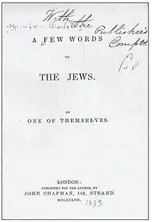 Montefiore devoted herself to charitable works and was particularly interested in the support of Jewish schools, including the Jews' Free School. She was a founder of the Jewish Emigration Society and of the Jewish Ladies' Benevolent Loan and Visiting Society.[3] In 1841 she founded the "Cheap Jewish Library" (see below) with the help of Grace Aguilar and Rabbi David de Aaron de Sola.[4] In the same year appeared (anonymously) her satirical novel Caleb Asher which attacked evangelical conversion movements directed at the Jewish community. In 1851 she published, again anonymously, a collection of essays A Few Words to the Jews, by One of Themselves. This set out the duty of British Jewry to improve "the rough and uncultivated nature" of the Jewish working class in England "for, if it is left to its own untutored guidance, it may stray into a wrong channel." Her authorship of all these works was only revealed after her death.[3][5][1]