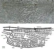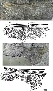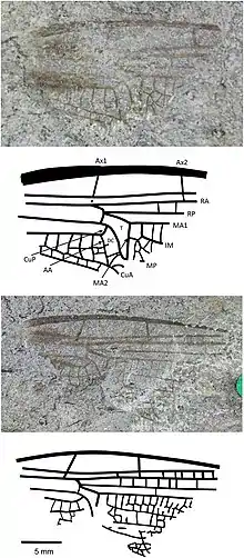| Anglophlebia | A. gigantea | NHMUK In.51030, part and counterpart of partial forewing | Damsel-dragonfly | ![]() | ||