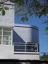 This two-storeyed rendered masonry house, with a flat sheet metal roof concealed behind a parapet wall, sits on a level southeast corner site in Ascot. The building shows a strong Functionalist approach in its design, with architectural and decorative elements including brick banding, which is now painted over, curved corner walls and windows, glass bricks and contrasting vertical and horizontal elements.[1]
