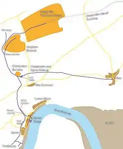 The first railway at Chattenden was a standard gauge line laid by the Royal Engineers in the early 1870s. This was used to bring building materials from a wharf at Upnor to be used in the construction of the Chattenden Munitions Depot.[2] According to a report in the issue of "Iron" dated Saturday 29 May 1875: "A detachment of non-commissioned officers and men of the Royal Engineers, commanded by Lieutenant Barker, on Saturday left the School of Military Engineering at Chatham for Upnor, where they will be quartered for some time, as they are to be employed to lay down lines of rails to connect forts on the Thames and Medway with the new powder magazines to be constructed at Chattenden Roughs, a few miles from the old magazines at Upnor Castle. It is expected that more than forty miles of these railways will be constructed."[3] This railway fell out of use when the building work was completed.[2]