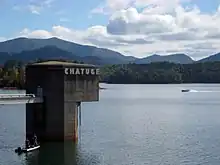 Lake Chatuge is a man-made reservoir in Towns County, Georgia, and Clay County, North Carolina. It lies along the Hiwassee River created by the Chatuge Dam which finished construction in 1942.[2] The lake is relatively shallow with depths of 30 feet (9.1 m) and reaches 144 feet (44 m) by the dam. Lake Chatuge is the highest major lake in the state of Georgia. [3]