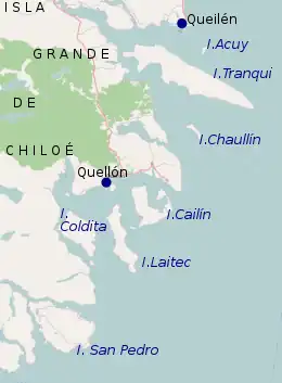 ![]() South east of Chiloé Island: Quellón, Chaullín, Acuy, Tranqui, Coldita, Cailin, Laitec, Queilén | |
