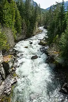 The Cheakamus River (pron. CHEEK-a-mus) is a tributary of the Squamish River, beginning on the west slopes of Outlier Peak in Garibaldi Provincial Park upstream from Cheakamus Lake on the southeastern outskirts of the resort area of Whistler. The river flows into Cheakamus Lake before exiting it and flowing northwest until it turns south and enters Daisy Lake. Between the outlet of Daisy Lake and its mouth, much of its length is spent going through Cheakamus Canyon, where the river flows through swift rapids and even one good sized waterfall. The river flows south from the lake and through the canyon before joining the Squamish River at Cheekye, a few miles north of the town of Squamish. The river's name is an anglicization of the name of Chiyakmesh ("people of the fish weir"), a village of the Squamish people and a reserve of the Squamish Nation.