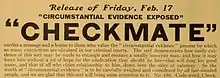 The only known credit for the film is that it starred William Garwood.[1] Film historian, Q. David Bowers notes that the plot dealing with circumstantial evidence focused on one of Lloyd Lonergan's social issues. Lonergan would produce several scenarios featuring the problems with circumstantial evidence being used to obtain convictions. Bowers notes that such convictions were a known social issue, but not a pressing one in 1911. The first such Thanhouser film to tackle the subject was Love and Law released in December 1910. Love and Law was a film which garnered some criticism for an improbable plot.[2] Checkmate wove a more tangled web of circumstantial evidence and intrigue and the resolution comes not from an astute female detective, but by the heiress's novel substitution of a doppelgänger to the prison so that the original can get the needed confession.[1] The serious nature of the film was highlighted with the advertising of the film by Thanhouser which states, "Checkmate carries a message and a lesson to those who value the 'circumstantial evidence' process by which so many convictions are obtained in our criminal courts. The reel demonstrates how easily evidence of this sort may be made to entangle and ensnare a totally innocent man..."[3]