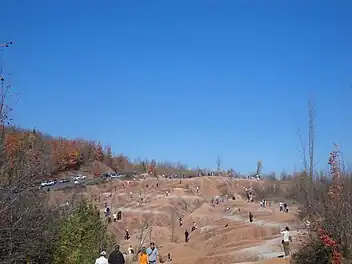 On May 6, 2015, the Ontario Heritage Trust announced that the Badlands site would be closed to visitors for several years at the end of May, due to the excessive number of visitors who were walking on the formations, causing damage that accelerated the erosion.[19] In July 2015 the Badlands were fenced off and closed to visitors; signs were erected marked "no trespassing", and the parking areas were changed to no-parking and tow-away zones. The closure was indicated as temporary as public consultation and a master plan study were underway. The area re-opened on September 22, 2018.[20] The newly reopened site features an accessible boardwalk, a new trailhead, and way-finding signs, and a new parking area has been created to manage traffic concerns and provide safe public access to the site.[20] Educational signs were also added to the site as part of the Visitor Infrastructure Improvement project, which began in 2017.[20]