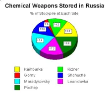 Russia entered the CWC with the largest declared stockpile of chemical weapons.[54] By 2010 the country had destroyed 18,241 tonnes at destruction facilities located in Gorny (Saratov Oblast) and Kambarka (Udmurt Republic), where operations have finished, and Shchuchye (Kurgan Oblast), Maradykovsky (Kirov Oblast), Leonidovka (Penza Oblast) while installations are under construction in Pochep (Bryansk Oblast) and Kizner (Udmurt Republic).[55] By 2016, Russia destroyed around 94% of its chemical weapons, planning to completely destroy its remaining stockpile by the end of 2018. On September 27, 2017 Russia announced the destruction of the last batch of chemical weapons, completing the total destruction of its chemical arsenal, ahead of schedule.[56]