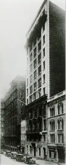 The Chemists' building at 52 East 41st Street, New York City, New York, United States was built by the architects York and Sawyer, replacing previous numbers 50-54. York and Sawyer filed the plans in January 1910[2] and completed the work in March 1911. The building opened on March 17, 1911.[1]: 6–7 Several days of events were held to celebrate the opening. A number of scientific papers were presented, ranging from "The characteristics of living matter from the physico-chemical point of view" by Jacques Loeb to "The chemistry of phosphorescence" by Wilder Dwight Bancroft and "The contributions of chemistry to sanitation" by William P. Mason.[7]: 20