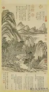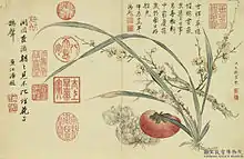 Chen Shu (simplified Chinese: 陈书; traditional Chinese: 陳書; pinyin: Chén Shū; 1660–1735) was a female Chinese painter during the early Qing dynasty. She was born in Xiuzhou (now Jiaxing) and was also known by the courtesy name Nanlou and her literary names "Shangyuan Dizi" and "Nanlou Laoren". She is considered the first female painter of Qing dynasty as well as the inaugurator of Xiushui School painting style.[1] Apart from her artistic works, she was also known as the mother of Qing statesman and poet Qian Chenqun (zh:钱陈群). After the early death of her husband, Chen raised her son by herself. When the latter became a prominent statesman in the court of the Qianlong Emperor, he introduced the emperor to his mother's paintings. Through this avenue she became favored by Qianlong, and many of her works were featured in the imperial collection (today in both the Palace Museum in Beijing and the National Palace Museum in Taipei). Chen painted figures, landscapes, and flower-and-bird paintings.[2]