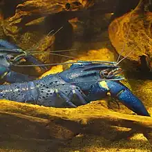 The hairy marron ranges in colour from olive green to brown to black, with females sometimes having red or purple patches on their undersides.[4][5][6] Adult hairy marrons grow to between 300 and 400 mm with a body consisting of a head and thorax that are protected by a carapace.[4][5][6] The body eventually extends into an abdomen that ends in a muscular tail, and the body is bracketed by 5 pairs of legs including two pairs of pinchers; a larger pair for capturing prey and defense and a second, smaller pair for fine manipulation of food.[5][6] The hairy marron can be differentiated from the smooth marron by the hairy bristles that are known to sometimes cover its carapace and other body parts, although these bristles can be difficult to observe in juveniles.[4][5][6]