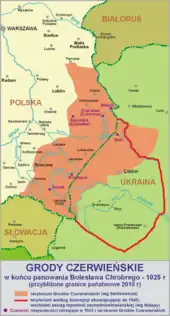 Cherven Gords in 1025 AD, under the rule of Bolesław I the Brave of Poland, superimposed over contemporary boundaries