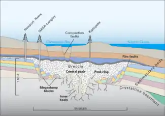 The Chesapeake Bay impact crater is a buried impact crater, located beneath the mouth of Chesapeake Bay, United States. It was formed by a bolide that struck the eastern shore of North America about 35.5 ± 0.3 million years ago, in the late Eocene epoch. It is one of the best-preserved "wet-target" impact craters in the world.[3]