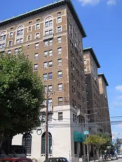 Chestnut Hall, formerly known as Hotel Pennsylvania, was designed by Clarence E. Wunder, and built in 1922.[2] Wunder is also responsible for designing Bonwit Teller at 1700 Walnut St (in 1927) and the Neuweiler Brewery (in 1913).[3] The 10-story building's architectural style is Renaissance revival. The building consists of a steel structure, a cement and brick facade, and an entablature with accompanying cornice along the top. Once built, the building served as the Hotel Pennsylvania. In the 1940s it became known as the Hotel Philadelphian.[4] It was sold to Sheraton Hotels in December 1946,[5] and was renamed the Penn-Sheraton Hotel. Sheraton sold the hotel to Hertfield Hotels in October 1953,[6] and they renamed the Penn-Sheraton very slightly,[7] changing it to the Penn Sherwood Hotel.[2] In 1962, the hotel rejoined Sheraton as a franchise, operating as the Sheraton Motor Inn until 1966. In June 2006 Apartment Investment and Management Company (Aimco) bought a majority stake of the property.