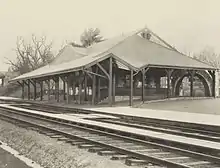 The Brookline Branch of the Boston and Worcester Railroad was extended west to Newton Upper Falls by the Charles River Branch Railroad in November 1852. Chestnut Hill was added as a flag stop by 1858.[3] After 1886, loop service on the Highland branch was run via what is now the Framingham/Worcester Line and later the Needham Line. The final trains on the line ran on May 31, 1958. The line was converted to light rail by the M.T.A. and Chestnut Hill reopened on July 4, 1959, along with the rest of the line.[1] The original stone station was torn down and replaced by a small wooden shelter on the inbound platform.