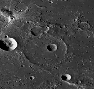 Just to the west of the rim of Chevallier is Atlas A, a sharp-rimmed, bowl-shaped crater.