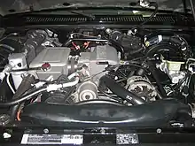 The 4.3 L (262.5 cu in) LV3 V6 is an all-new engine announced by GM at the end of 2012. GM considers this a new engine design which inherits from its predecessors its displacement, 2-valve pushrod valvetrain, 90-degree cylinder angle, and 4.4 in (111.8 mm) bore centers. It is based on the fifth-generation LT engine and includes the same features such as direct injection, piston cooling jets, active fuel management, variable displacement oil pump, continuously variable valve timing, and aluminum cylinder heads and block. The engine is SAE certified to 285 hp (213 kW) at 5300 rpm and 305 lb⋅ft (414 N⋅m) at 3900 rpm on regular unleaded gasoline and 297 hp (221 kW) at 5300 rpm and 330 lb⋅ft (447 N⋅m) at 3900 rpm on E85. Emissions are controlled by a close-coupled catalytic converter, Quick Sync 58X ignition, returnless fuel rail, and fast-response O2 sensor.[11] It was launched in the all-new 2014 Chevrolet Silverado and GMC Sierra 1500.[12] 2021 was its final model year in the Chevrolet Silverado and GMC Sierra 1500, as the 6-speed automatic transmission was phased out. The Chevrolet Express and GMC Savana are the last vehicles to use the 4.3L but do not feature Active Fuel Management and their version of the engine is referred to as the LV1.