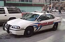 The eighth generation W body Impala was powered by the 3.8L Buick V6 engine. The 3.8L V6 was mated to a heavy duty four-speed 4T65-E HD transmission and made 200 horsepower at 5,200 rpm and 200 lb-ft of torque at 4,000 rpm.[4] Mechanically, the 8th generation 9C1 featured many upgrades over the standard Impala including auxiliary oil coolers for the engine oil, power steering, and transmission, a heavy duty radiator with heavy duty fans and extended life coolant, heavy duty front struts, heavy duty shock absorbers, police calibrated brakes, heavy duty front brake pads, and a 125 amp alternator. The 8th generation 9C1 had a 0-60 time of 9.2 seconds and a top speed of 124 mph. Also, traction control was not available on the 9C1. The interior featured several features not available on civilian Impalas including stab-proof front seatbacks, heavy duty front seats, a 100 amp auxiliary power point in the trunk, and "Surveillance Mode"; which was a button that disabled all interior lights to allow officers to hide themselves better. The 9C1 featured a standard AM/FM radio, standard dual zone climate control, a standard driver side torso airbag (2005), and lockout protection; which prevents the driver from locking the keys in the ignition in the event someone tries to lock the doors.[5] This generation 9C1 was very popular with large inner-city departments such as the NYPD.