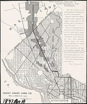 On June 6, 1890,[4] when his group of straw purchasers had accumulated 1,712 acres (6.93 km2), Newlands incorporated the Chevy Chase Land Company to bring the parcels together for development.[1] That year, the Washington Star newspaper called it the "most notable transaction that has ever been known in the history of suburban property."[1]