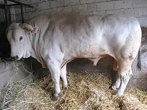 The Chianina is one of the oldest breeds of cattle. It originates in the area of the Valdichiana, from which it takes its name, and the middle Tiber valley.[4] Chianina cattle have been raised in the Italian regions of Tuscany, Umbria and Lazio for at least 2200 years.[5] Columella, writing about types of oxen in about 55 AD, says "Umbria vastos et albos ..." (VI.I.2),[6] which in the first English translation is "Umbria has such as are huge, and of a white colour".[7]:258 Chianina oxen were the principal source of agricultural power in the area until displaced by mechanisation and the collapse of the mezzadria system following the Second World War; they were in use in agriculture until at least 1970[8] and are still used in processions such as the corteo storico of the Palio di Siena. From 1931 breeders began to favour selection of animals more suited to meat production, with shorter limbs, longer bodies and more heavily muscled rump and thighs; recently, selection is based also on factors such as growth rate, meat yield and, in cows, maternal ability.[5] While one source reports a herdbook dating from 1856,[9] others date the institution of the Libro Genealogico ("genealogical herdbook") to 1933, when a breed standard was established and commissions were set up by the then Ministero dell'Agricoltura e delle Foreste (ministry of agriculture and forestry) to identify, mark and register morphologically suitable animals; the standard of the Chianina breed was fixed by ministerial decree of 7 August 1935.[10] A private register was previously kept by the largest cattle breeder of the Sienese Valdichiana, the Eredi del conte Bastogi of Abbadia di Montepulciano,[10] and a group of breeders had in 1899 formed a society, the Società degli Agricoltori della Valdichiana (society of farmers of the Valdichiana), of which a principal aim was the establishment of a herdbook.[11][12]