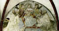 Also present are the Scenes from the Life of the Virgin from the Coronation of the Virgin to the Annunciation, all dating from 1345 to 1347 and tentatively assigned to Giotto's school. The drum is decorated with lesser quality saints.