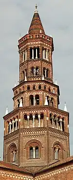 The exact date of construction of the tower is unknown, but it has been dated to 1329–1340 and attributed to Francesco Pecorari from Cremona due to its resemblance to the Torrazzo di Cremona and the belltower of the San Gottardo church in Milan. Additions from the 18th century were removed in the 1905.