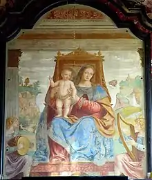 Of the 13th-century cloister today only the southern side and two bays remain. It is decorated by a Virgin Enthroned with Child Honoured by Cistercians (early 16th-century), once attributed to Gaudenzio Ferrari and today to Callisto Piazza. The fresco is sided by the inscription in semi-Gothic script celebrating the church's consecration in 1221, surmounted by a stork.