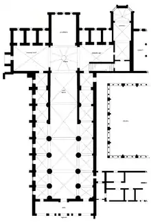 After a series of temporary buildings had been constructed, the construction of the permanent church was begun around 1150–1160; it was consecrated on 2 May 1221. Works continued in the 13th century with the first cloister, south of the church, and, in the 14th century, the crossing tower and the refectory. In 1412 a small chapel was built next to the southern transept. Today it is used as the sacristy.
