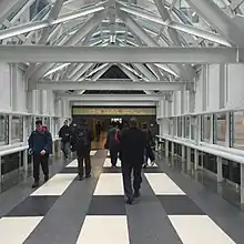 The smaller but more elaborate eastern section of the pedway, connecting the Illinois Center buildings, Hyatt Regency, Fairmont Hotel, Swissôtel, and (later) Aqua, are indirectly accessible from the main (Loop-centric) pedway network, as each is linked to one end of the Metra Electric Line rail platforms. Since the Regional Transportation Authority's removal of the turnstiles in November 2003, the two large pedway sections have been united by the platforms.
