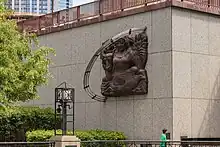 It is a 7 ft (2.1 m) x 12 ft (3.7 m)[6] sculpture and it weighs 3.5 tons.[1] The sculpture is a depiction of a woman holding grain in her hand while she embraces a bull.[7] There is also an eagle in the piece. The design of the sculpture represents the city of Chicago's dominance of commodities markets in the mid-1950s. The design elements also show the rebirth of Chicago as a leader in transportation, and it was a depiction of the Chicago Stockyards.[5]
