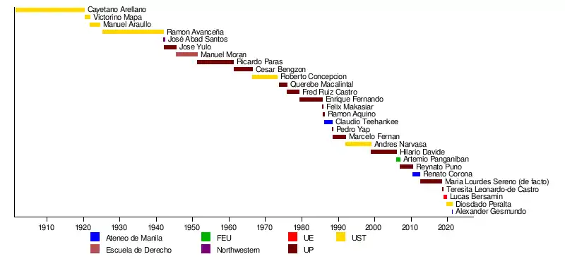 - The longest period one person served as chief justice was 18 years, 294 days in the case of Cayetano Arellano, who served from 1901 to 1920. Arellano was 73 years, 29 days old upon his resignation, the greatest age ever reached by an incumbent chief justice, and a record unlikely to be broken with the current mandatory retirement age of 70.