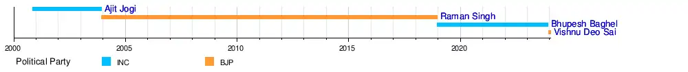 Four people have served as the state's chief minister since Chhattisgarh's formation on 1 November 2000 as a result of the Madhya Pradesh Reorganisation Act, 2000.[3] The first was Ajit Jogi of the Indian National Congress. He was succeeded in 2003 by Raman Singh of the Bharatiya Janata Party who served three consecutive five-year terms. Third person to serve in the office was Congress leader Bhupesh Baghel ,who served from 2018 to 2023, was succeeded by Vishnudeo Sai, the current incumbent, following the resounding victory[4] of Bharatiya Janata Party in the 2023 elections.