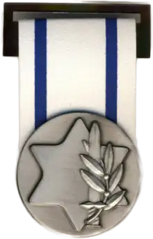 The medal is attached to a white ribbon with two blue strips on the edges, similar to those on the Israeli flag.