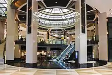 A midrise podium building surrounds the tower. Retail arcades are located on the lower levels, while the upper levels of the podium building are used as commercial offices (for most of the building's history, as trading floors for a succession of investment banks). The entrance foyer for the retail arcades is located on the southwestern corner of the building, facing Chifley Square.