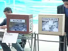 Ballot boxes for votes for mayors and council people, seen on a polling station in Peñalolén.