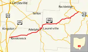 State Route 180 (SR 180) is a 29.55-mile (47.56 km) long east–west state highway in the southern portion of the U.S. state of Ohio. SR 180 has its western terminus at a Roundabout with SR 159 nearly 5 miles (8.0 km) northeast of Chillicothe. Its eastern terminus is at a diamond interchange with the U.S. Route 33 (US 33) expressway approximately 3.75 miles (6.04 km) northwest of Logan.