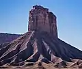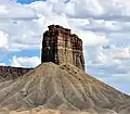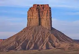 Chimney Rock is located on the Colorado Plateau, and is composed of Cretaceous Point Lookout Sandstone, which is the oldest of the three formations that make up the Mesaverde Group which is common to the Mesa Verde region.[4][5] The cliff-forming Point Lookout Sandstone overlays a pedestal of softer, slope-forming Mancos Shale.[6] Precipitation runoff from this feature drains into the Mancos River watershed.